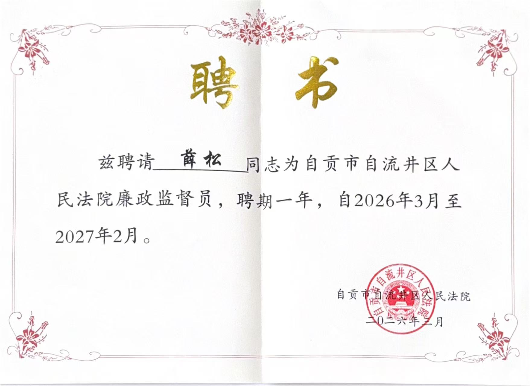 品冠动态|品冠所薛松律师受聘担任自流井区人民法院廉政监督员